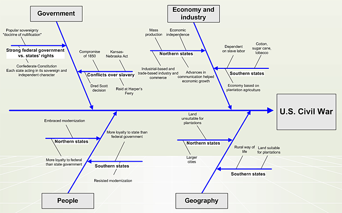 In this chart, major categories of causes include people, the government, the economy, and geography, while primary causes include northern states and southern states, among others. The ‘head’ of the fish is the main event: the Civil War.